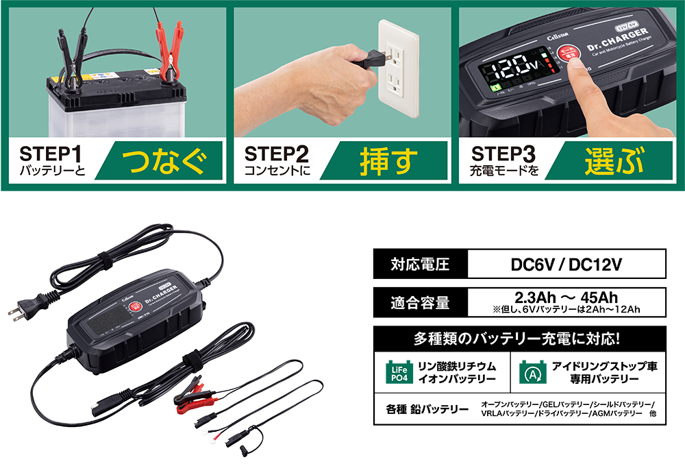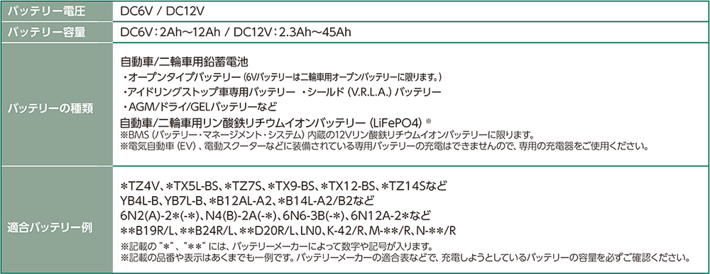 ●本機で充電できるリチウムイオンバッテリーは、DC12Vの自動車用および二輪車のBSM(バッテリー・マネージメント・システム)を内蔵したリン酸鉄リチウムイオンバッテリー(LiFePO4)のみです。それ以外のリチウムイオンバッテリー、電気自動車(EV)や電動スクーターなどに装備されている専用バッテリーには絶対に使用しないでください。*バッテリーの過熱、発煙、発火、爆発の恐れがあります。