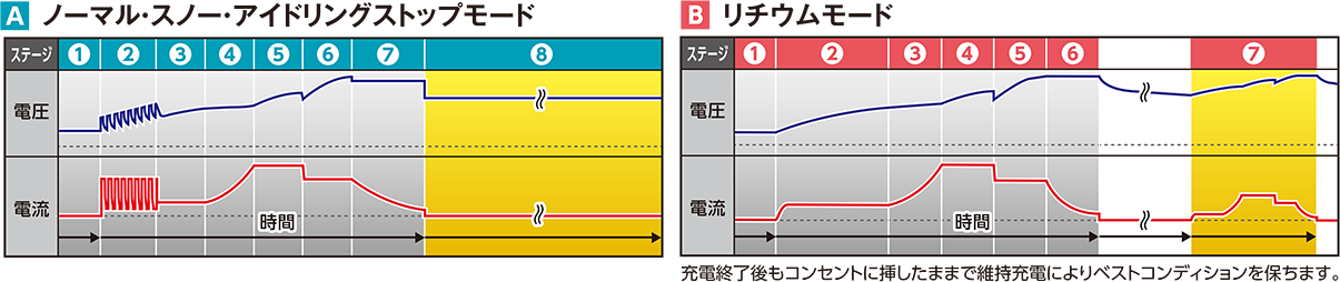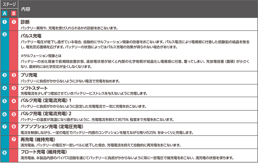 8段階自動充電制御(リチウムモードは7段階)で最適な充電を行ない、