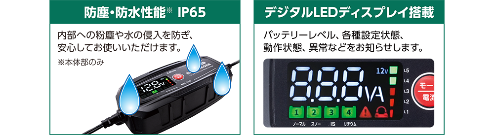 | 充電電流(最大) | 0.8A/1.5A/3A(6Vバッテリー時0.8Aのみ) | |